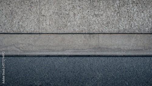 Overhead perspective of urban street surface featuring concrete slabs, contrasting black and white curb edges, and asphalt roadway