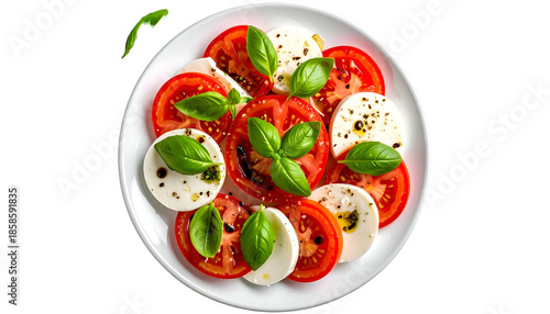 Overhead shot of a caprese salad on white plate with fresh tomatoes, mozzarella, basil