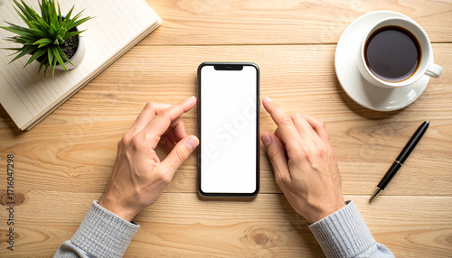 Overhead Shot of Smartphone on Wooden Desk with Coffee, Plant and Pen