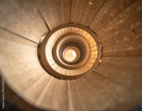Overhead spiral staircase, looking down a circular architectural wonder with sunlit, aged wooden steps