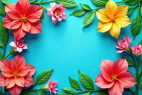 Overhead vibrant paper flowers, green leaves, blue backdrop, paper flowers, green