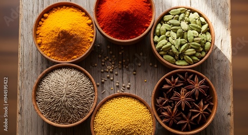 Overhead view of wooden bowls filled with diverse colorful spices and herbs set on weathered wood table creating rustic culinary display