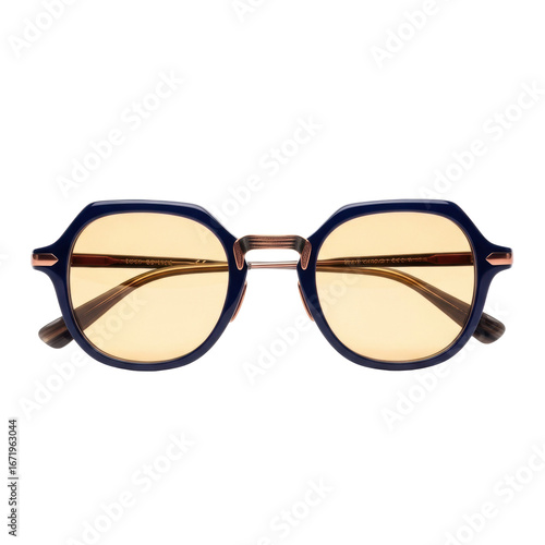 Oversized hexagonal spectacles, deep indigo horn frames, copper bridge, amber lenses, on transparent background, bright studio light, intellectual concept