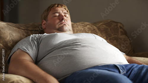man, adult, overweight, rest, sleep, nap, relax, couch, sofa, home, domestic, indoor, leisure, comfort, peaceful, calm, eyes closed, serene, casual attire, daytime, soft light, shadow, candid, lifestyle, health, wellness, fatigue, sleepy, lazy, horizontal, alone, one person, male, adult male, tranquil, to rest, quiet, brown, grey, blue, jean, t-shirt, body, corpulent