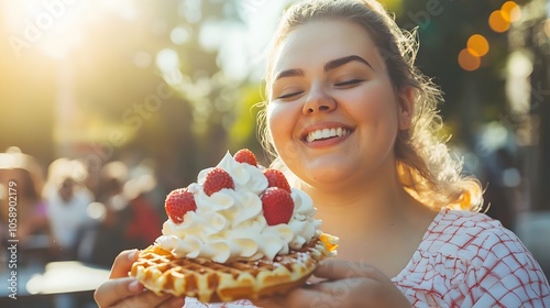 woman, waffle, strawberry, overweight, happy, outdoors, food, enjoyment, sweetness, dessert, indulgence, refreshment, summer, sunny, relaxation, leisure, tasty, delicious, appetence, pleasure, comfort, treat, snack, dinner, casual attire, lifestyle, joy, satisfaction, savoury, temptation, energy, gathering, dining, life events