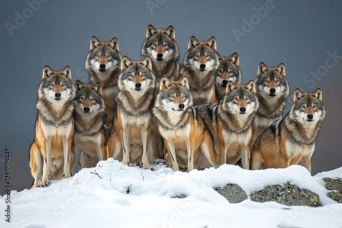 Pack Of Wolves. Winter Gathering of Wolves on Hilltop, United States. Watching, Traveling Together in Snow