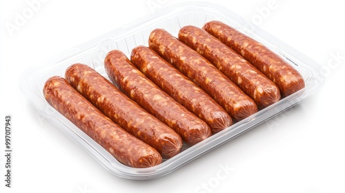 Packaged gourmet sausages in a clear plastic tray, with a white label, set on a white background, emphasizing the product premium quality and cleanliness.