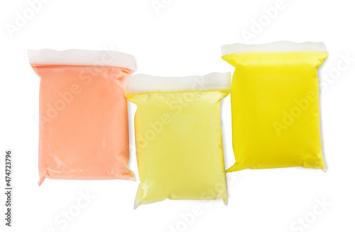 Packages of colorful play dough on white background, top view
