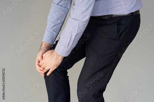 Pain In Knee. Close-up Businessman Leg With Painful Kneeson on gray background. Man Feeling Joint Pain, Having Health Issues And Touching Leg With Hands. Body And Health Care Concept.