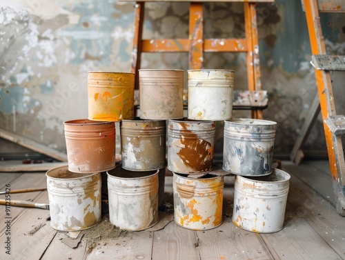 Paint cans, renovation, building work, DIY.