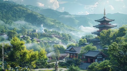 painting, temple, mountain, colourful, forest, buddhist, religious, shrine, asia, china, japan, korea, architecture, building, culture, heritage, landscape, scenery, artwork, vibrant, peaceful, serene, tranquil