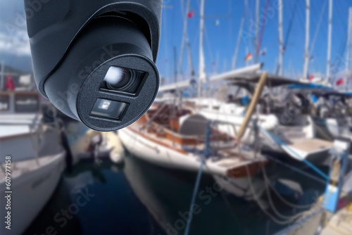 Pair of outdoor security cameras in yachting harbor.