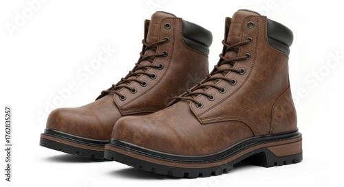 footwear, boot, leather, brown, work, construction, rugged, hard-wearing, safety, protection, outdoors, style, fashion, gear, equipment, pair, isolated, white, background, object, detail, texture, craftsmanship, design, closeup, perspective, angle, view, image, classic, heavy, duty, robust, walking, hiking, lace, lace, tread, sole, comfortable, industrial, workshop, man, material, boot, casual attire, trend, wear