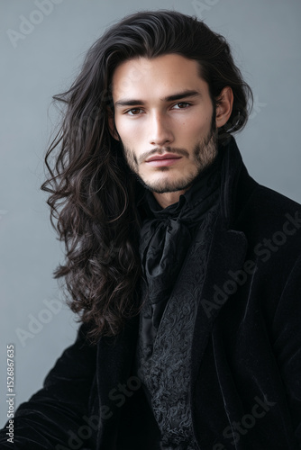 man, victorian, historical, jacket, vampire, gothic, romantic, moody, elegant, dark, vintage, black, fashion, aristocratic, mysterious, dramatic, intense, photogenic, regal, classic, brooding, tailored, timeless, dandy, refined, formal, old world, baroque, gentleman, cinematic, steely, theatrical, aesthetic, portrait, opulent, textured, chiseled, masculine, fantasy, period, hair, long hair, pale, beard, vertical