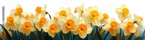 daffodil, spring flower, green leaf, white background, blooming, fresh, cheerful, bright, garden, botanical, closeup, macro, floral, ornamental, seasonal, early spring, cut flowers, bouquet, arrangement, decorative, vibrant, natural, plant, flowerbed, delicate, flower petals, stem