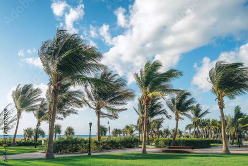 Palm trees bending in strong winds symbolize storm safety and preparedness.