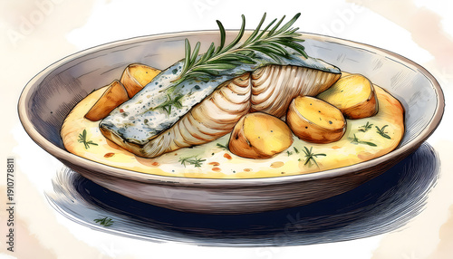 food, seasoning, bistro, bowl, cooking, cookery, culinary, delicious, dinner, drawing, eating, fillet, fine dining, fish, fresh, fried, garnish, epicure, grilled, hand-drawn, healthy, herb, lunch, meal, mediterranean, nourishment, plate, plating, potato, protein, receipe, eatery, roasted, rosemary, salmon, sauce, savoury, seabass, seafood, vignetting, tasty, trout, watercolor