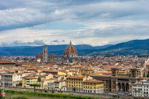 Panaromic view of Florence townscape cityscape viewed from Piazzale Michelangelo (Michelangelo Square) with magnificent Renaissance dome designed by Filippo Brunelleschi