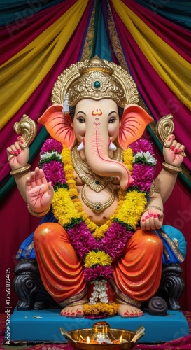 celebration, ganesh, idol, hinduism, festival, decoration, worship, spirituality, tradition, culture, colourful, garland, sacred, deity, ritual, indian, ceremonial, prayer, icon, devotion, blessing, heritage, auspicious, peace, prosperity, festivity, elephant, god, statue, offering, drapery, art, religious, spirit, high-coloured, ornate