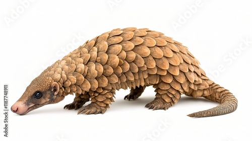 Pangolin: A close-up portrait of a pangolin, an intriguing and rare mammal known for its unique scaly armor. It walks on its short legs, its tiny nose pointing forward.