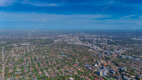 Panorama aerial drone view of western Sydney Suburbs of Canterbury Burwood Ashfield Marrickville Campsie with Houses roads and parks in Sydney New South Wales NSW Australia
