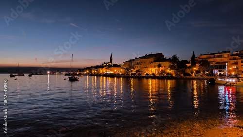 panorama of illuminated Rovinj seen from the harbor at dusk