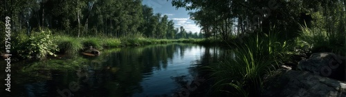 Panoramic 360 degrees view of a serene river landscape in nature hdr imagery hdri