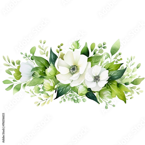 Panoramic Composition of Watercolor Flowers with bright green leaves..Panoramic Composition of Watercolor Flowers with bright green leaves.
