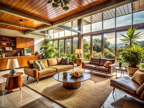 Panoramic Mid Century Modern Living Room Interior Design Stock Photo