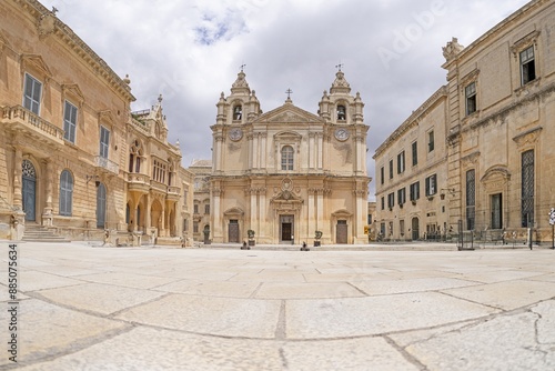 Panoramic picture of St. Paul's Cathedral in the historic Maltese city of Mdina with a deserted forecourt