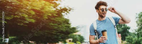 happy, travel, smiling, summer, outdoors, happiness, cheerful, caucasian, smile, man, drink, emotion, urban, beverage, emotional, street, tour tourism, panorama, panoramic, journey, walk, outside, goggles, casual attire, t-shirt, photogenic, trip, positive, holiday maker, voyage, weekend, traveler, summer, good-looking, promenade, one person, young adult, looking away