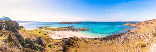 Panoramic shot of Smirisary Beach while The Small Isles of Rum, Eigg and Muck in background, Smirisary Beach, Lochailort, Scotland, UK