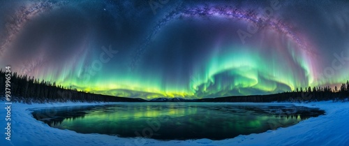 Panoramic Starry Sky with Aurora Borealis Over a Frozen Lake