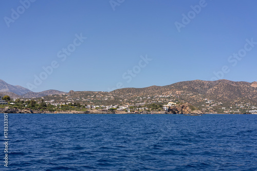 Panoramic view of Agios Nikolaos town on the coast of Crete, Greece, captured from the sea on a sunny day. The image features blue Mediterranean water, distant mountains, and the picturesque urban