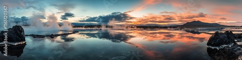 panoramic, view, reflected, still, water, lake, steaming, geothermal, wind, adding, surreal, atmosphere, resolution