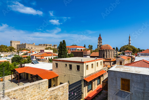 Panoramic view of Rhodes old town on Rhodes island, Greece. Rhodes old fortress cityscape. Travel destinations in Rhodes, Greece.