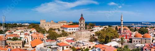 Panoramic view of Rhodes old town on Rhodes island, Greece. Rhodes old fortress cityscape with sea port at foreground. Travel destinations in Rhodes, Greece.