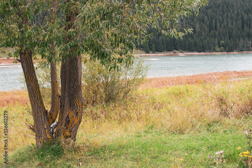 Panoramic view of the mountain lake in front of the mountains, national park