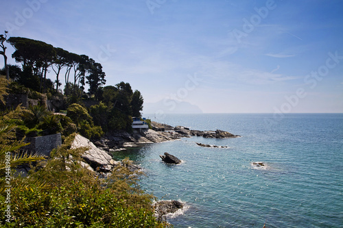 genoa, italy, blue water, rock, coast, panorama, blue skies, paseo, pedestrian, romantic, mediterranean, liguria, sea, gulf, coastline, sightseeing, travel, sunny, bright, vegetation, wood, tree, lush, green, summer, landscape, seascape, park, garden, leisure, walking, season, scene, nature, beautiful, sunlight, tour tourism, vacation, relaxation