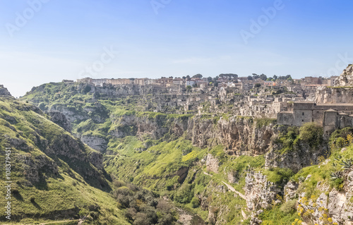 panoramic view of typical stones (Sassi di Matera) and church of Matera UNESCO European Capital of Culture 2019 under blue sky