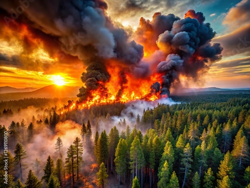 wildfire, forest fire, fire, landscape, panoramic, smoke, flames, destruction, nature, disaster, environmental, emergency, danger, heat, intense, dramatic, sunset, sky, tree, charred, wood, wilderness, devastation, ecological, global warming, climate change, inferno, blaze, burning, outbreak, conflagration, firestorm, burnt, ash, ember, rural, countryside, red sky, firefighter, aerial view, hi-res, photo, image