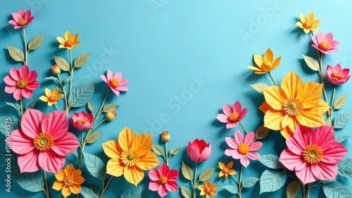 Papercut floral composition, light blue background, flowers along the edges, frame for potscards, invitation, copy space, place for text, horizontal. 8th March concept