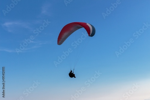 paragliding, paraglider, parachute, silhouette, blue skies, extreme sport, adventure, flying, flight, freedom, aerial, gliding, sport, recreation, adrenalin, risk, thrill, sky, canopy, harness, pilot, leisure, hobby, summer sport, travel, tour tourism, nature, cloudless, clear sky, solo, person, man, fly, high altitude, soaring, glider, wing, wind, outdoors, sport, activity