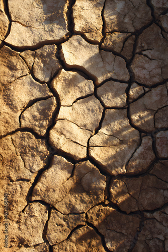 Parched earth with deep cracks, symbolizing drought and arid conditions under warm sunlight.