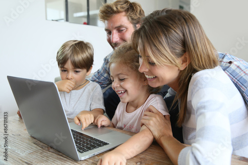 Parents with kids at home using laptop computer