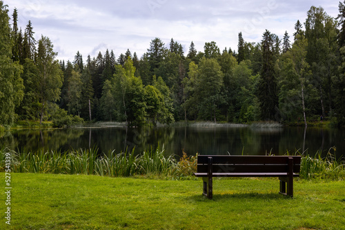 Park bench next to a calm pond in the park in Finland