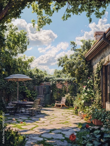 grass, green, lawn, garden, flower, tree, shrub, sunlight, summer, clear sky, fence, deck, patio, chair, table, shadow, relaxation, peaceful, tranquil, serene, home, backyard, private, house, residential, outdoors, sunny, bright, lush, nature, relaxing, family, leisure, lifestyle, scenic, exterior, pergola, sun tanning, hammock, swing, bench, picnic, bar-b-q, outbuilding, shed, pool, fountain, grill