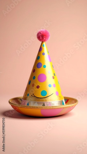 party, hat, conical, yellow, polka, dot, pink, purple, teal, pom-pom, birthday, celebration, festive, fun, joy, circus, colourful, decorative, paper, cone, accessory, decoration, celebratory, happy, smile, cartoon, graphic, design, three-dimensional, render, digital, image, isolated, single, object, pastel, light, background, orange, pinkish, pattern, cute, childhood