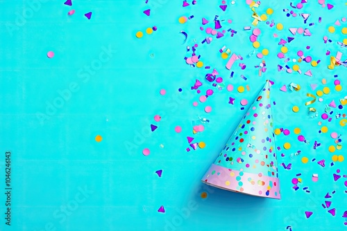 Party hat with colorful confetti on blue background.