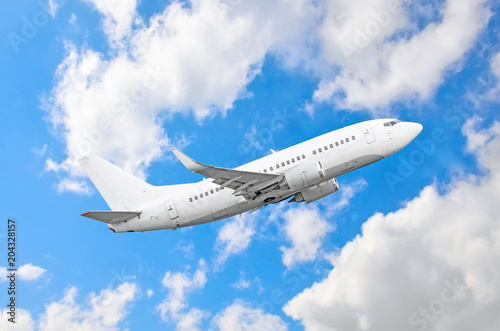 Passenger airplane fly on a hight above overcast clouds and blue sky.